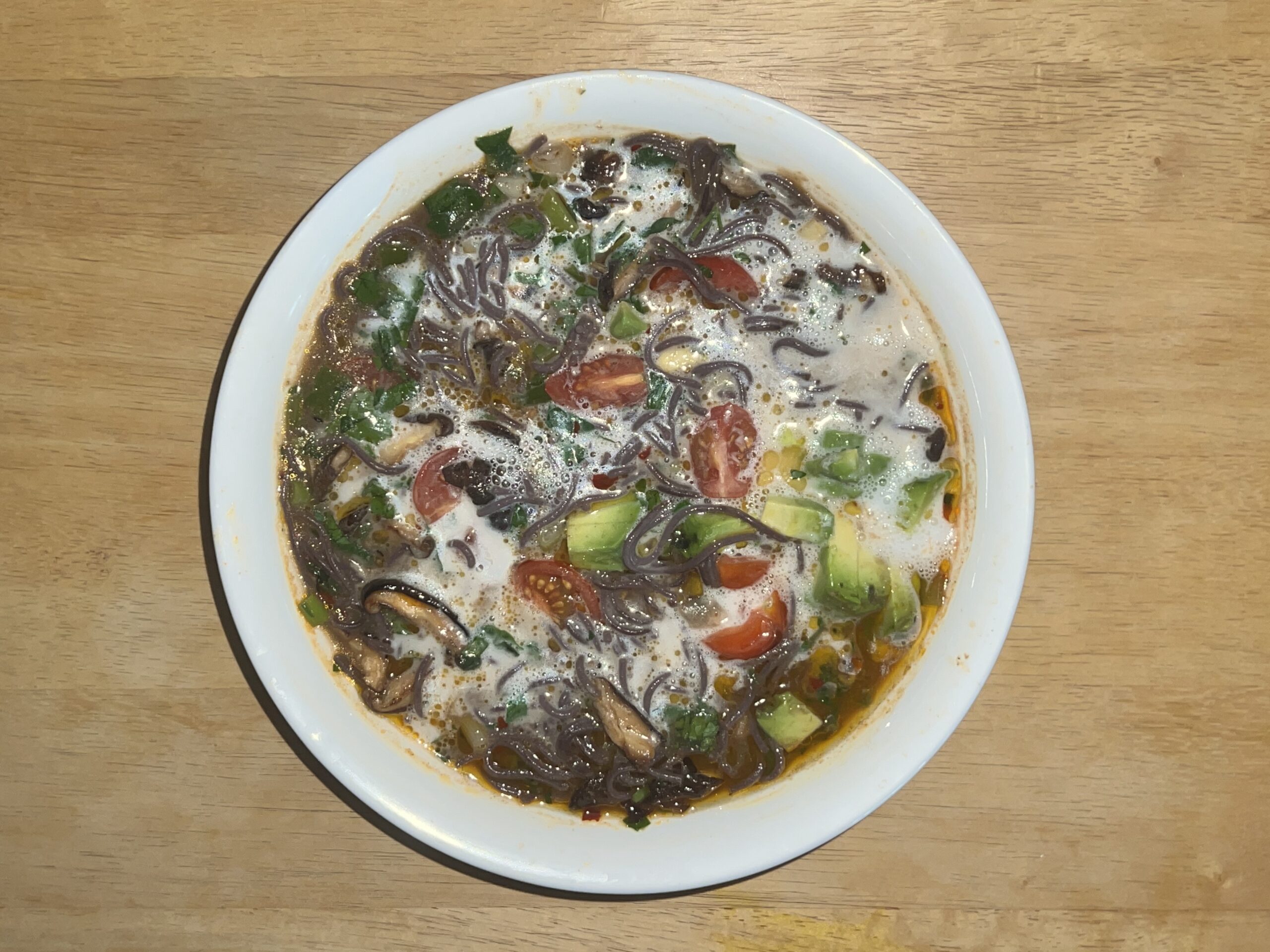 4. Finish the Soup: Remove the pot from heat. In your favorite bowl, add chosen grain (rice, ramen noodles, quinoa, or couscous) and generous amounts of soup. Drizzle with coconut milk and top with sliced avocado and cherry tomatoes. The cherry tomatoes will soften in the warm soup and provide a burst of flavor. Sprinkling with fresh chopped parsley.